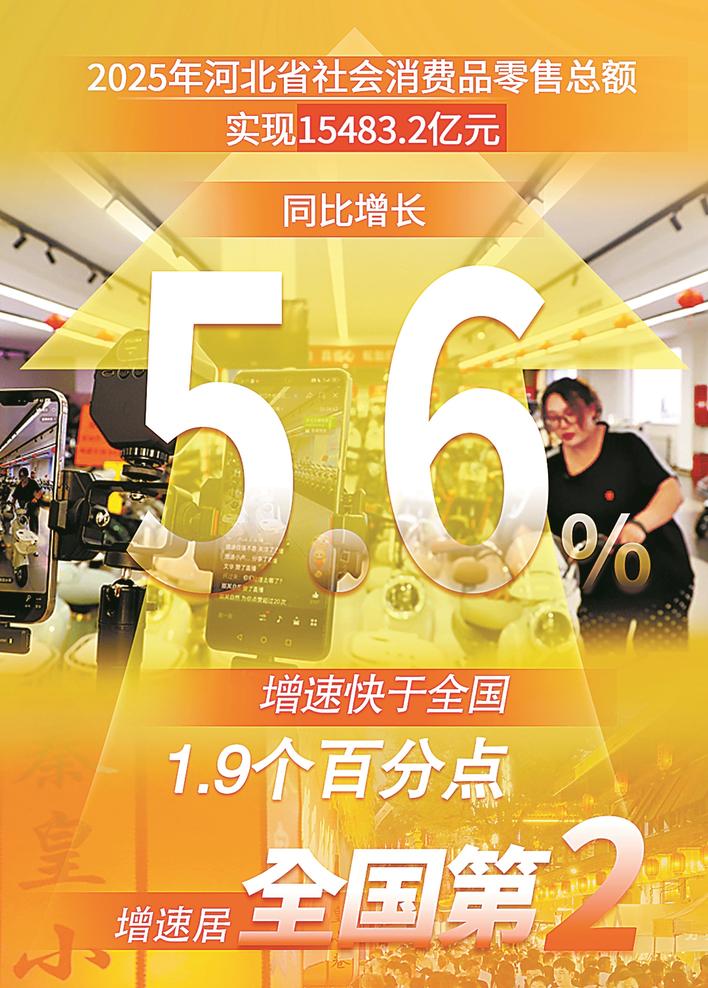 5.6%是2025年河北省社会消费品零售总额(以下简称“社零总额”)的同比增速,这个数字快于全国1.9个百分点,在全国排第2位,反映了河北扩内需、促消费政策落地显效。